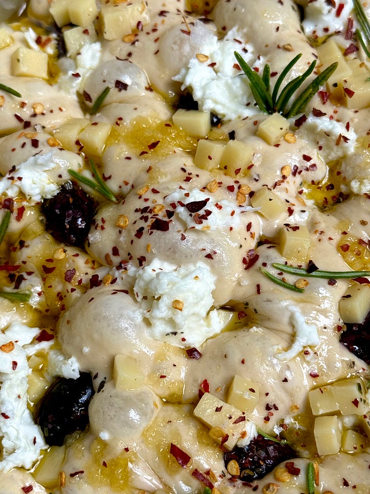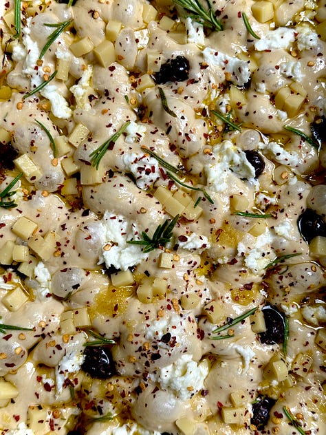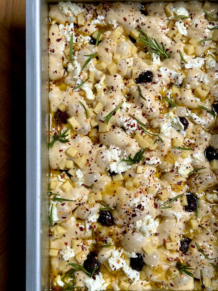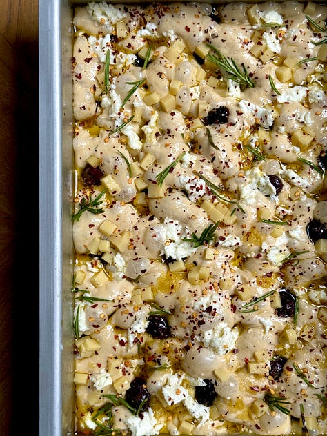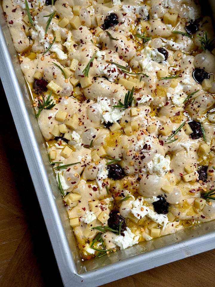 The version I am sharing with you today features double cheese (mozzarella and comte), lots of chilli (oil and flakes), kalamata olives (cause I could eat them by the bucketful)…and a key ingredient, stock. I’ve opted for chicken and a touch of marmite for that umami hit but to keep it veggie friendly, you can switch it for vegetable stock. Focaccia is made up of a high percentage of water, so why keep it bland when we can make it bougie?