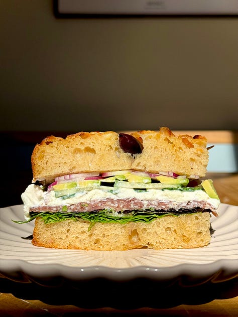 Use the bread to dunk, to slather or to sandwich when fresh (I opted for lots of salami, rocket salad, avo, cucumber and red onions, drizzled with a tonne of hot sauce cause I’m nothing without it) and then when you’re sandwiched out, toast slices slathered with a garlic and herb compound butter, turn it into croutons or blitz into the tastiest breadcrumbs when stale.