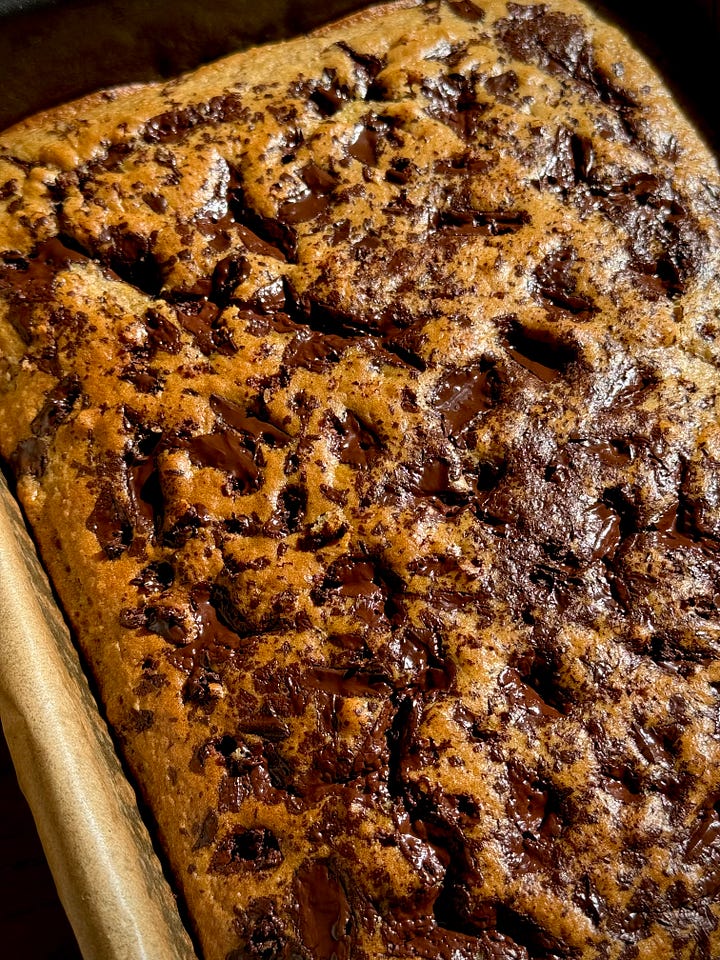 She might not be the sexiest bake in town but she's saucy, smushy and squelchy in all the right places. We're heading into Autumn so beige is all the rage, kids. Sprinkled and studded with dark chocolate, feel free to leave off of switch to milk chocolate for a sweeter alternative (would be my preference). Best served up piping hot and topped with ice cream, I ate it the next day cold, drowning it in steaming hot custard. A habit I hope I never drop.