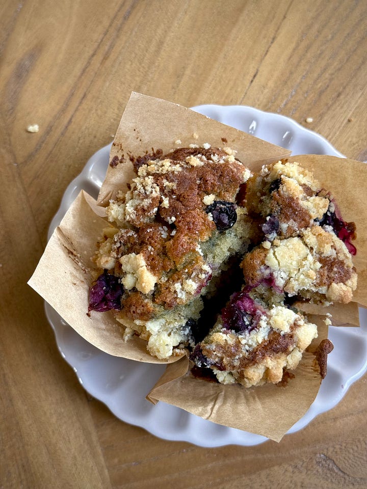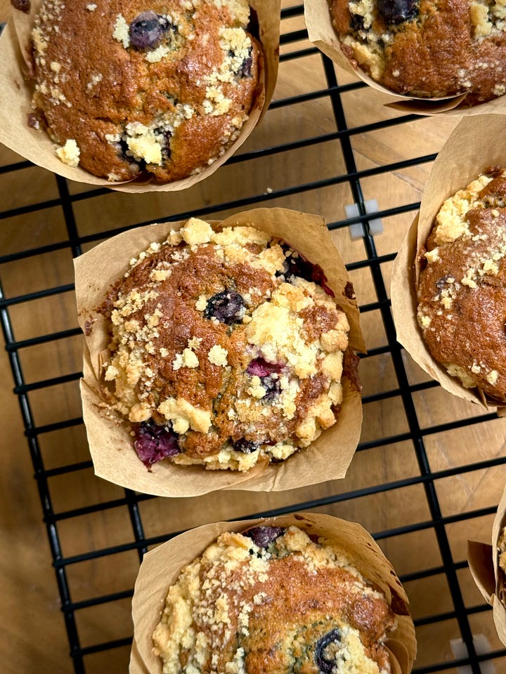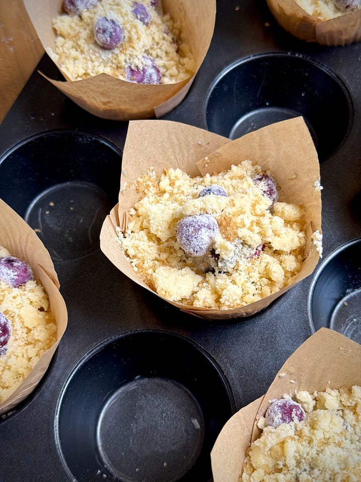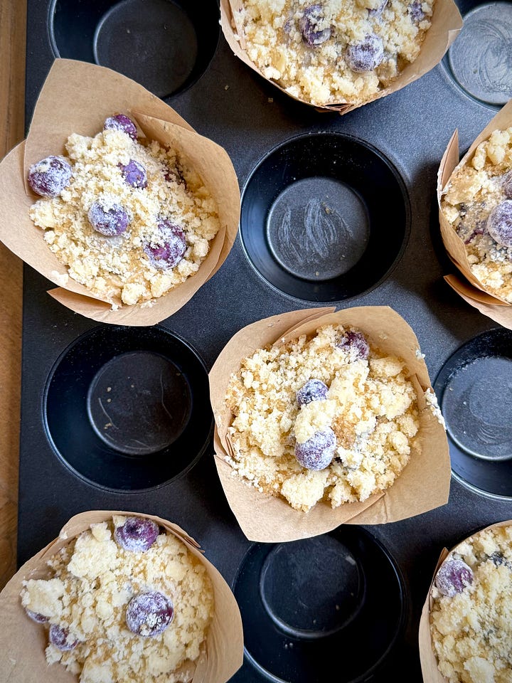Top each case with a few reserved blueberries and generously top each one with a good handful of crumble. You might think it is too much but the more the better.