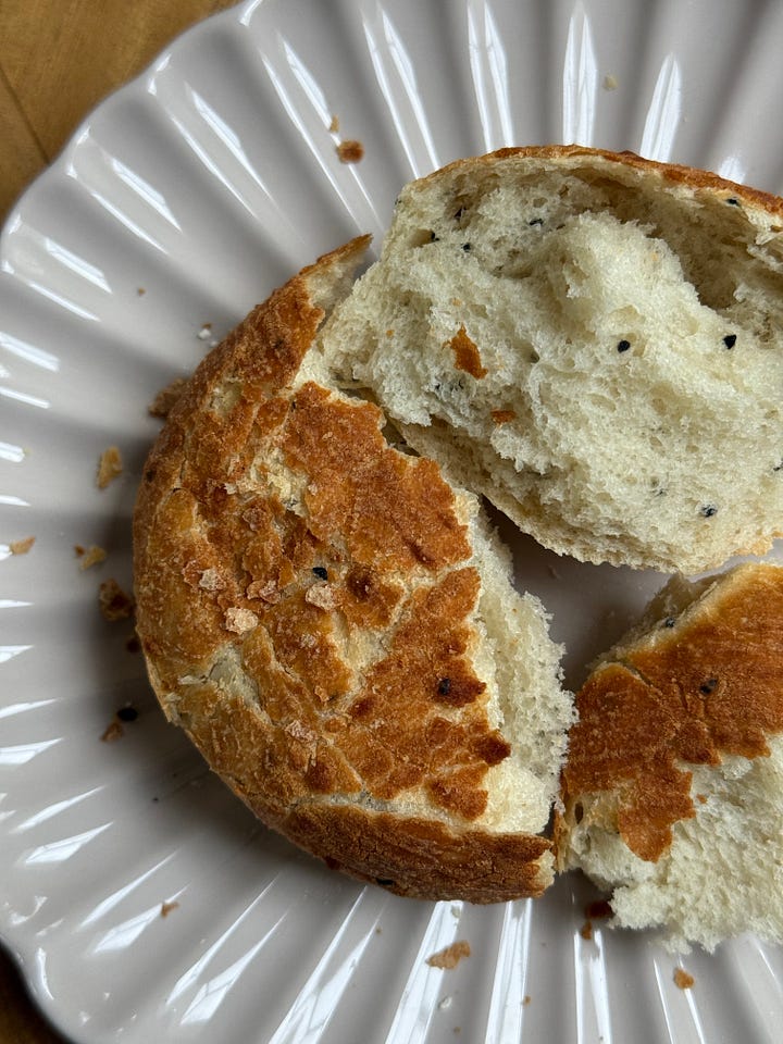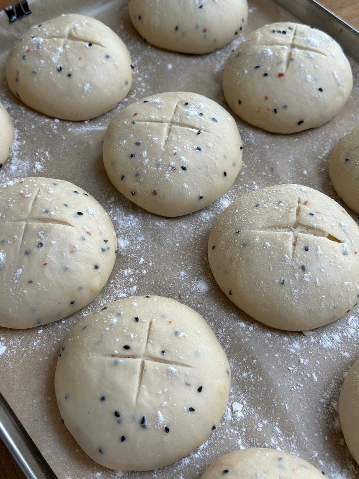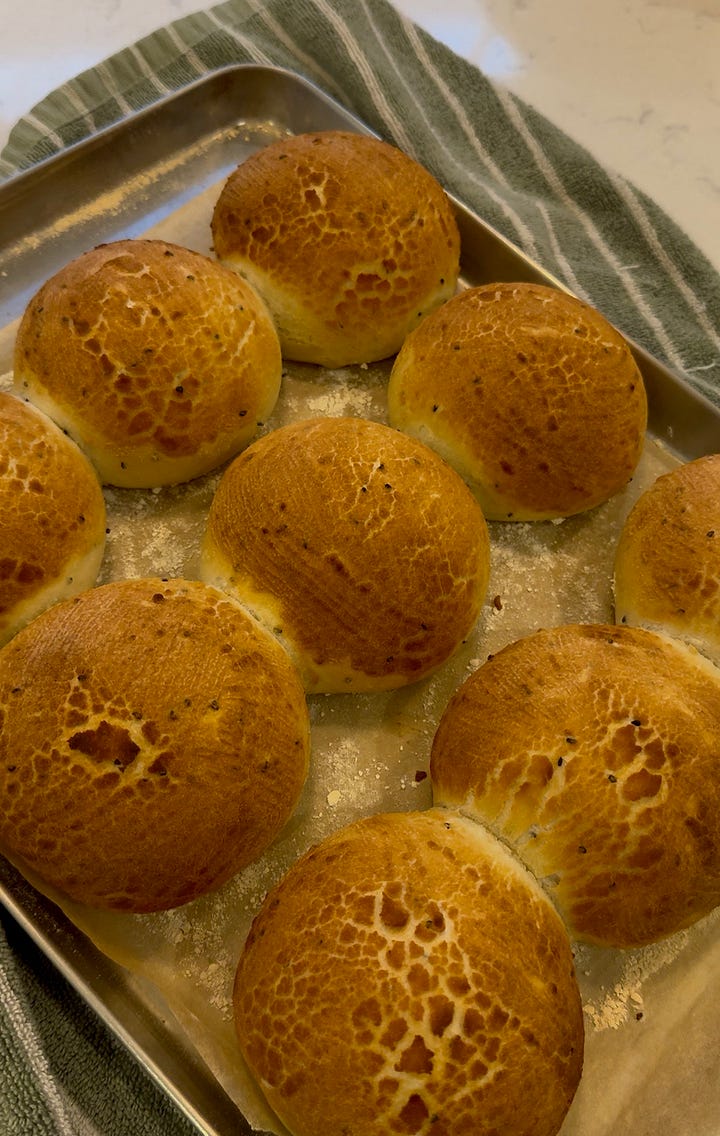 Store in a sealed container once cooled. The crunchy top will go soft after the first day, so to revive the rolls, bathe the tops of each roll in some water (don’t drench, just a light bathe) and pop into the oven at 180C Fan/200C/390F for about 10 minutes, or until the top is crisp and crunchy.