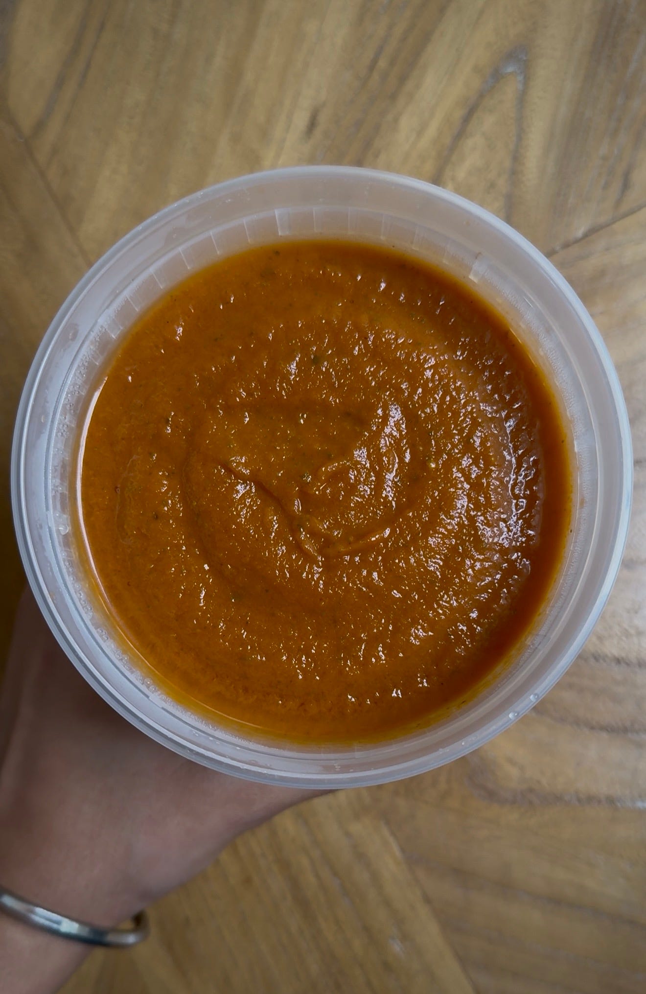 Once thick and the sauce is reduced, taste a final time before leaving to cool. Once cool, transfer to a large blender or processor and blitzing until smooth. If you are wanting to eat straight away. Puree using a hand blender (pls do not blend anything whilst piping hot – a disaster will ensue, you will accidentally paint your ceiling with soup and yes I am talking from experience).