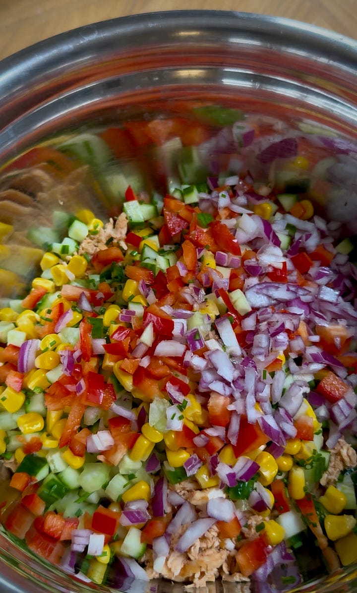 I use an array of veggies in my salad mix and will usually utilise whatever I have in the fridge so I urge you to personalise the below to your liking or to whatever you have available to you. Just make sure you have something crunchy (celery), something slightly sweet (sweetcorn/cucumber), something slightly acidic (red onion), something slightly fruity (red bell pepper) and a hefty amount of herbs (I went for chives but you could go for coriander, mint, or a touch of tarragon for a mild aniseed flavour). I also don’t give a precise measurement for some veggies so will say measure with your heart and your tastebuds.