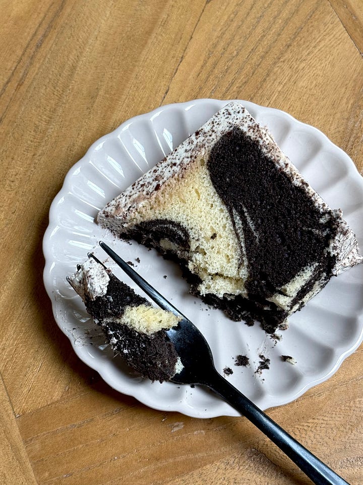 In addition to the above, we also have my Chocolate, PB & J Tray Bake (which I heartily recommend making if sadness ever finds you) and a Vanilla and Chocolate Marble Chiffon Cake, smothered in a chocolate speckled vanilla cream.