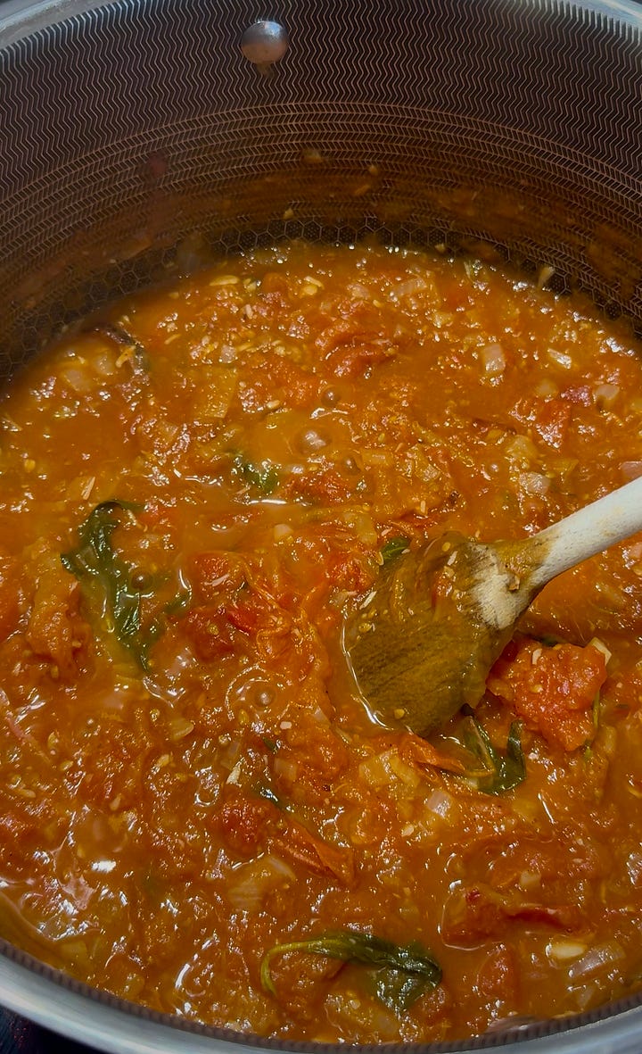Also to the pan, add the tinned plum tomatoes (add some water to the empty can to remove any residual sauce), whole basil, thyme leaves, chili flakes and bone broth.