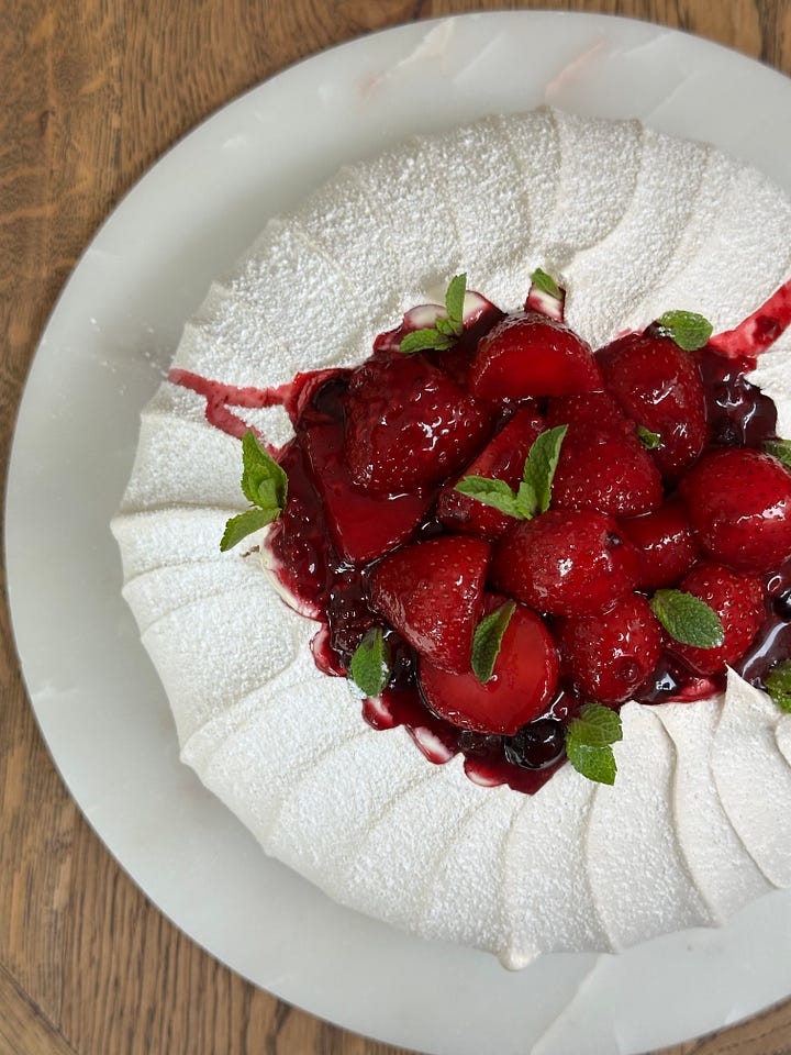First up, we have a dessert lots beloved by lots but feared by many. My Mixed Berry Pavlova IS THAT GIRL. She’s voluptuous (sounds rogue describing a dessert like that but when you see her, you’ll get it), mallowy in the middle, crisp and crunchy on the outside, topped with a velvety smooth crème légère (custard folded through whipped cream) and finished with a generous drizzling of a mixed berry compote. Adorned with a few mint leaves for a pop of colour and a hefty dusting of icing sugar, it’s a great prep-ahead pud.