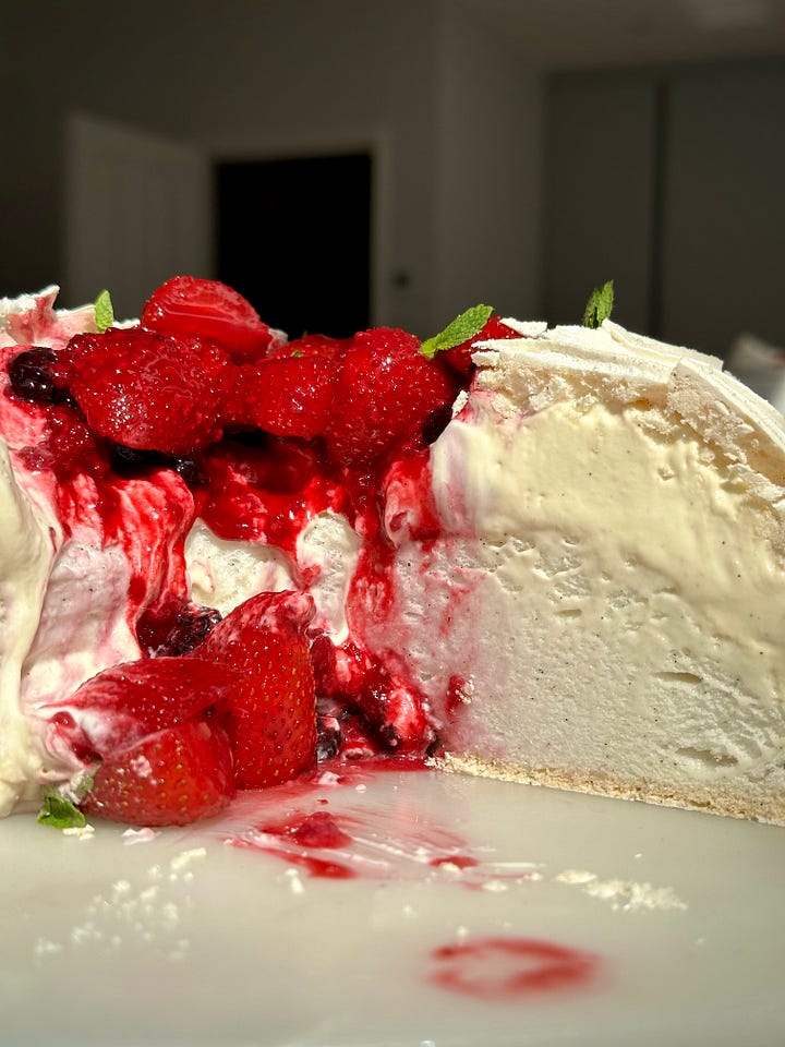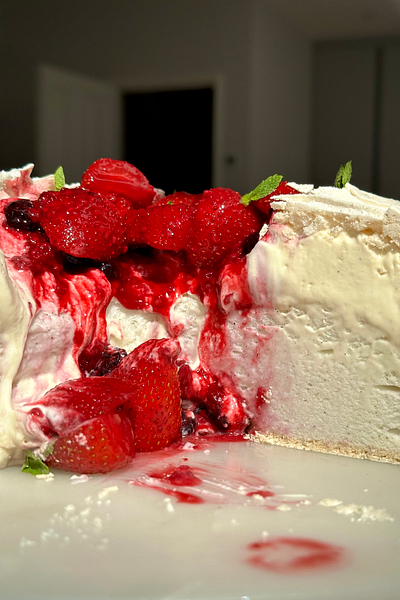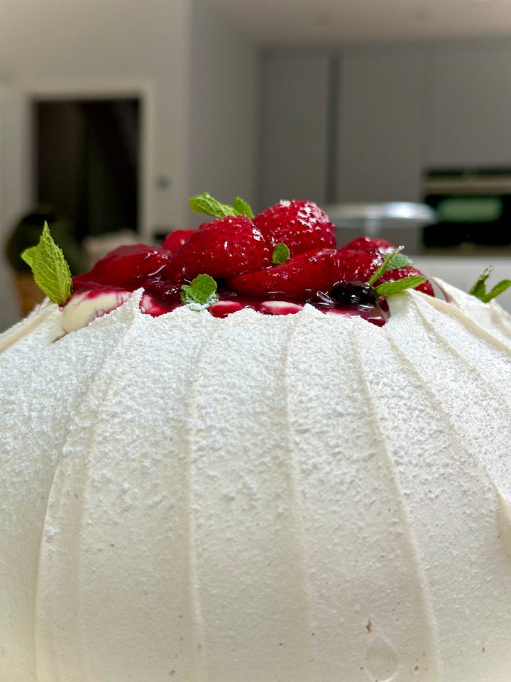 Gently spoon the whipped custard to the pavlova cavity and pile as high as you wish. Top with your mixed berry compote, lightly dust with icing sugar and serve.