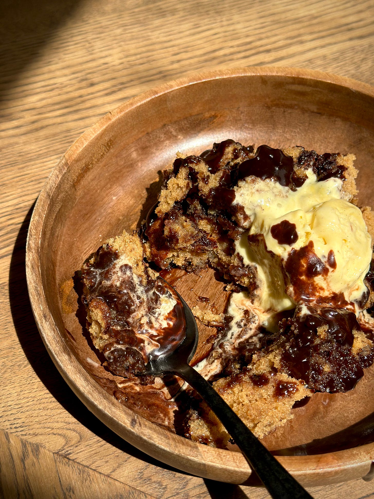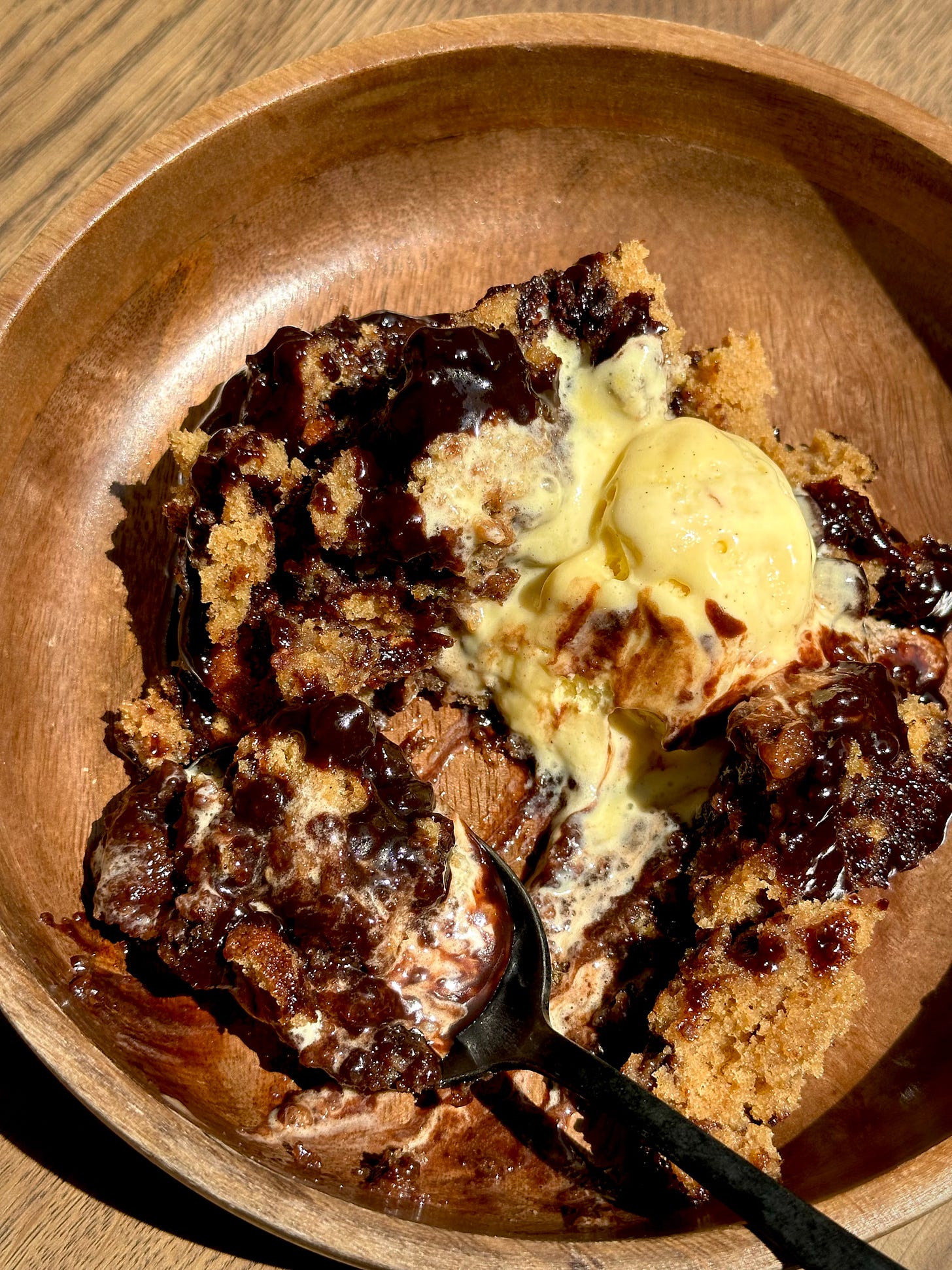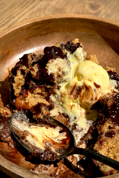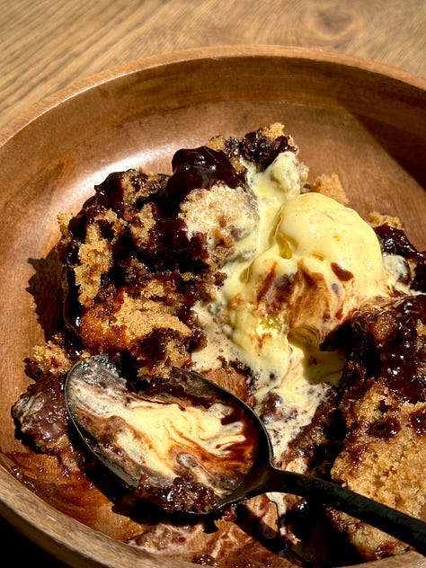 Made up of a moist ginger and date sponge studded with dark chocolate, sitting on top of a hidden brandy spiked chocolate and orange sauce, she’s the festive decadence you have been looking for. Using our new All Things Butter Brandy Butter (note I am a equity partner but will only ever recommend quality products I trust and use to you all) for that touch of warmth of background boozy note, this is a great alternative to a Christmas Pudding. If all of this floats your boat bar the brandy (I get it, we have little ones to also feed!), sub out the Brandy Butter for equal quantity unsalted for the same pud, same yum just now for everyone’s tums!.