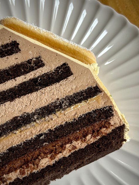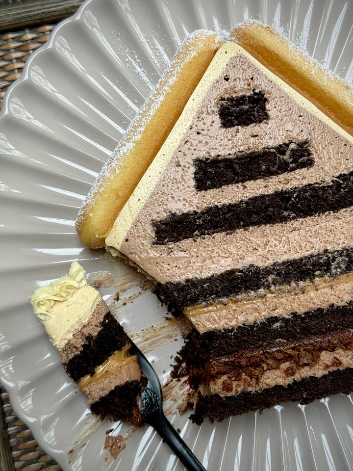 Repeat the cream, ganache and sponge finger process one more time before finishing with a smooth layer of cream and pouring on top the remaining chocolate ganache. If your ganache isn’t pourable or is a little too thick, add an additional 50 ml of double cream to your ganache and gently heat to loosen. Allow to cool before using because we don’t want to end up with melty mush.