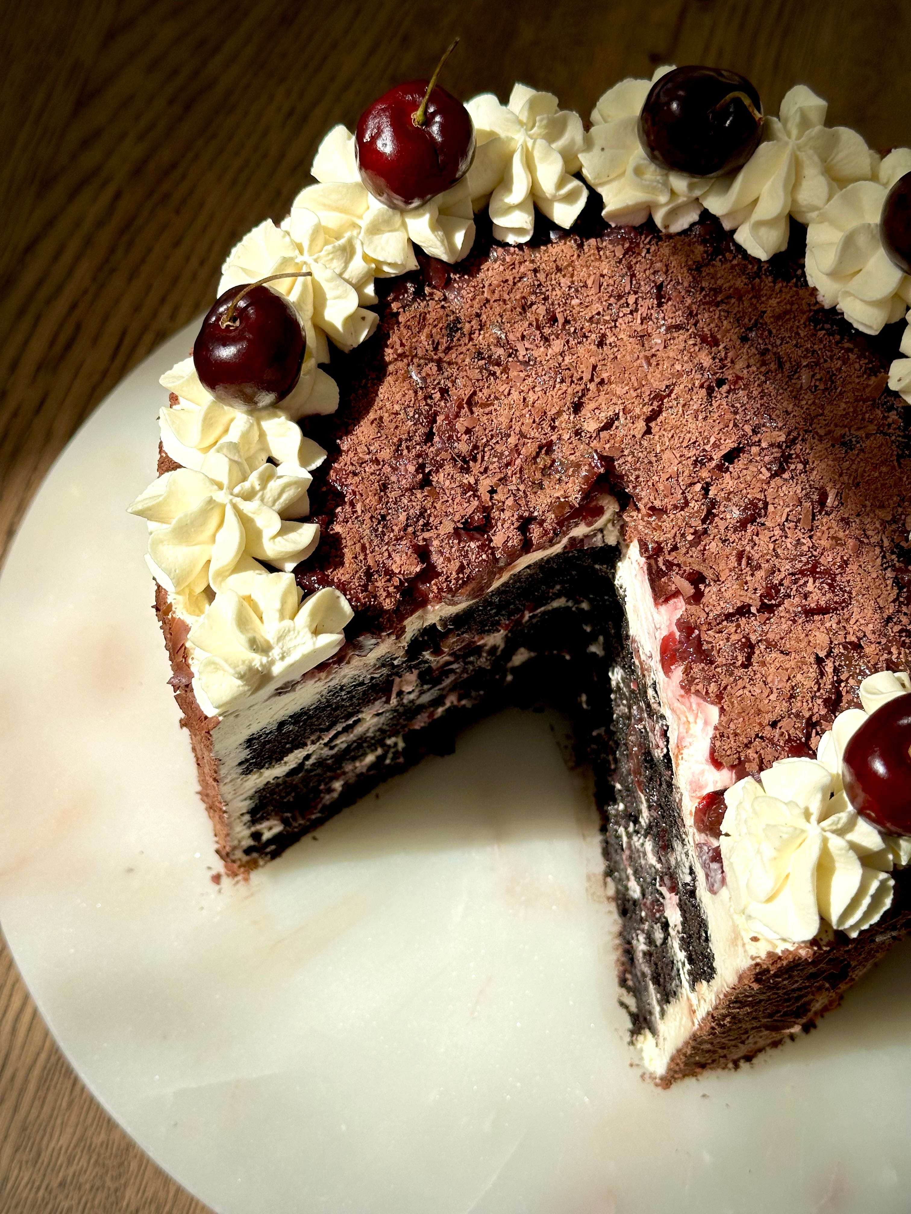 Nothing screams Christmas more than a Black Forest Gateaux. When growing up, we were treated to a frozen rendition from the supermarket (not knocking it, we used to demolish them) and I loved it so much, it was the very first cake I attempted to make when I first got into baking (I am going to furiously scroll through my phone to see if I can find said picture). Made up of tender, moist, rich chocolate sponges, soaked in Kirschwasser, topped with whipped cream and cherries – my current version is slightly bougier than the shop bought ones and so much more tastier (I promise I am not biased…).