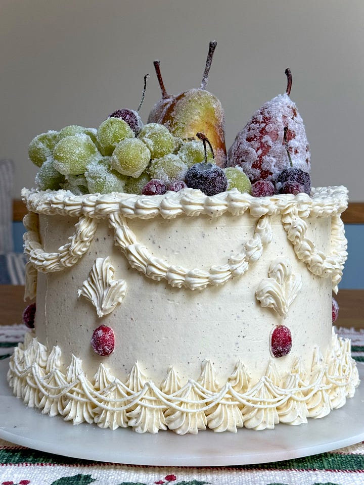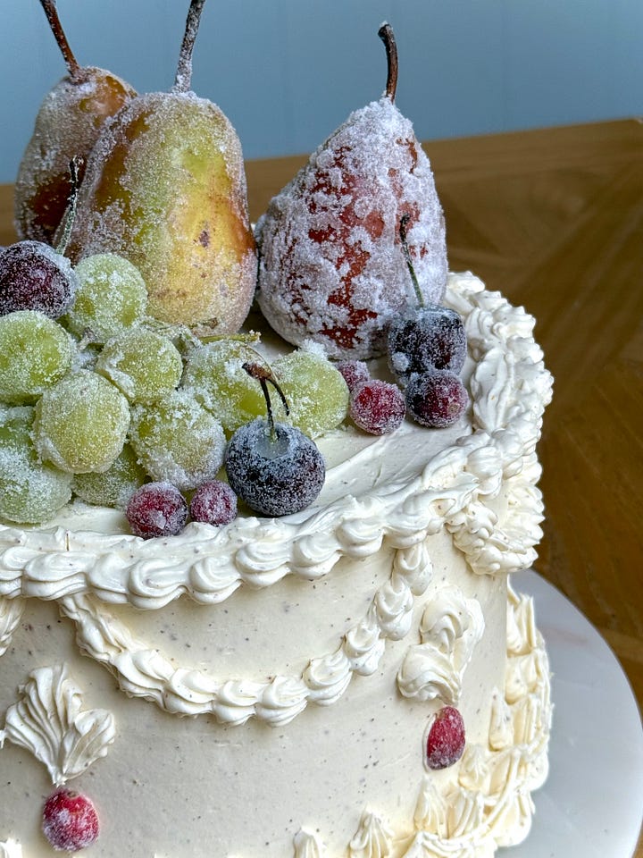 The cake is finished in beautifully delicate piping and adorned with sugared fruit to really take this up a notch on the extra level. It’s dramatic. It’s delicious. It’s extravagant. It’s OTT. And it’s a total must.