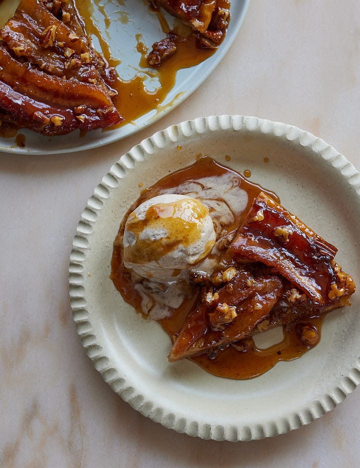 Continuing with the banana theme, we have my Banana Tarte Tatin with Cinnamon Rum Ice-Cream. This is a recipe from my book One Bake Two Ways - which fyi, is available on Amazon UK for £11.21 on promo at the moment making it a perfect stocking filler for any sweet-toothed fiends and bakers out there! As someone who has expressed their disdain for apples on more than one occasion here, this recipe came about as a delicious alternative to the classic. Ripe, roasted bananas bathed in a pecan and cinnamon caramel, sitting on a flaky homemade rough puff pastry and finished with a scoop of cinnamon rum no churn ice cream. Delightful, decadent and delicious.