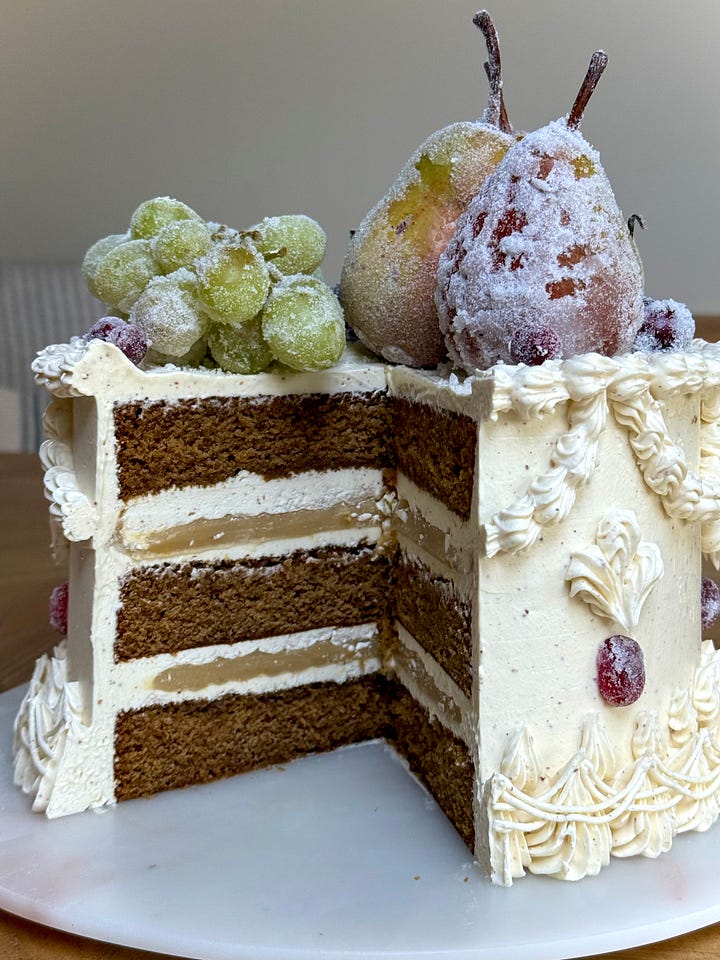 Rounding off the menu this week and our main bake of the day is my Sticky Ginger, Orange Butterscotch & Brown Butter Cake. When I tell you that this tastes of nothing but pure comforting joy, I am telling you a lie. Because it is so much more than that. It’s like a spoonful of joy, a dunking of warmth and a dip in a pool of deliciousness all wrapped up in one. 3 layers of sumptuously soft, moist, zingy sponge sandwiched between butterscotch spiked with orange zest and all smothered in a brown butter swiss meringue buttercream. Adorned with delicate piping and topped with sugared fruit for that showstopper finish. If you are looking for something to steal the show. This is ya gal right here.